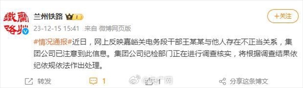 ·網(wǎng)傳國鐵蘭州局干部與女下屬存不正當關(guān)系,官方:紀檢部門正調(diào)查核實。