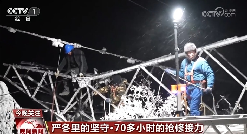 總臺記者 崔肖冉:這里的海拔超過1200米,現(xiàn)在室外氣溫降至零下20℃,感覺進(jìn)入了一個冰窖。我在室外大概走上15分鐘左右,就感覺整個關(guān)節(jié)凍得發(fā)疼,而此時此刻在距離地面大概20多米的高空,維修人員正在輸電線路上進(jìn)行緊急搶修,而且今天晚上風(fēng)很大,可想而知搶修難度有多大。
