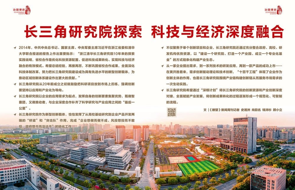 2003年底,在時(shí)任浙江省委書記習(xí)近平的親自推動(dòng)下,浙江清華長(zhǎng)三角研究院(以下簡(jiǎn)稱“長(zhǎng)三角研究院”)正式成立,落地浙江嘉興。作為浙江省人民政府與清華大學(xué)共建的新型創(chuàng)新載體,長(zhǎng)三角研究院成立以來立足浙江、面向長(zhǎng)三角,以自收自支、市場(chǎng)化運(yùn)營探索走出一條省校合作的有效模式,逐步成長(zhǎng)為長(zhǎng)三角區(qū)域重要的產(chǎn)學(xué)研試驗(yàn)平臺(tái)和成果轉(zhuǎn)化基地。