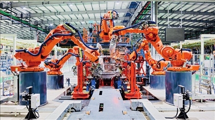 浙江清華長(zhǎng)三角研究院新能源汽車研發(fā)中心的新能源汽車制造焊裝線(2021年6月攝)。 浙江清華長(zhǎng)三角研究院供圖