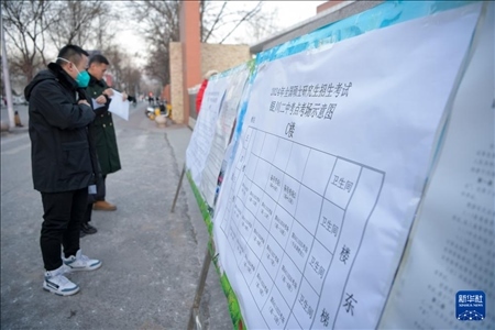 12月23日,考生在寧夏銀川市第二中學(xué)考點(diǎn)外查看考場分布圖。