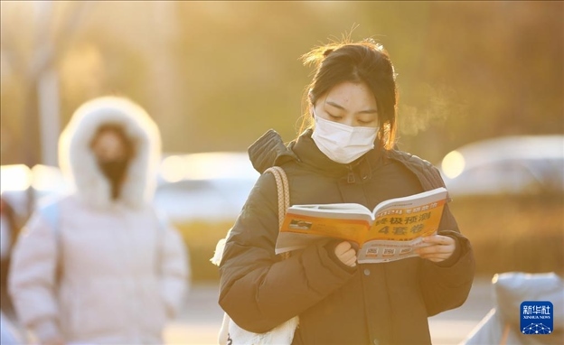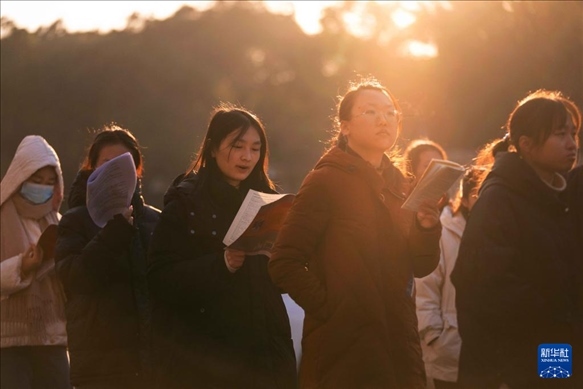 12月23日,在湖南省長沙市,考生在湖南農(nóng)業(yè)大學(xué)考點(diǎn)排隊時抓緊復(fù)習(xí)。