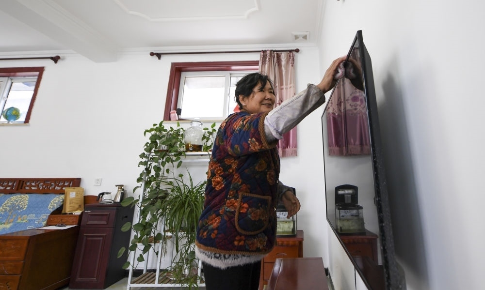 在北京市房山區(qū)佛子莊鄉(xiāng)陳家臺村,61歲的村民馬書金在修繕后的房子內擦拭電視(12月12日攝)。新華社記者 鞠煥宗 攝