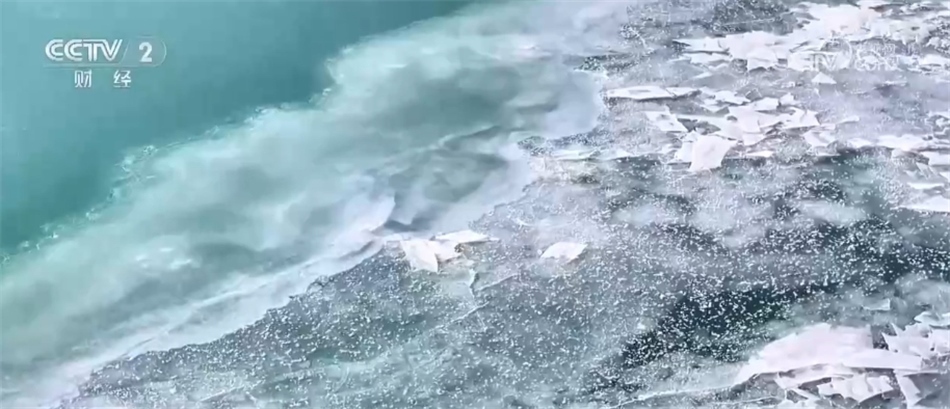 從空中俯瞰,金色的沙灘、潔白的冰線、剔透的碎冰以及蔚藍的湖面,共同構成一幅色彩明艷的線條畫。