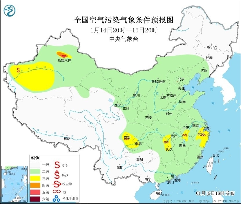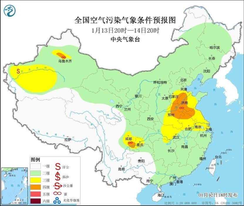 12日夜間至13日,華北中南部、黃淮、江淮、江漢、四川盆地等地大氣擴散條件較差,有輕至中度霾,其中天津、河北南部、山東西部、河南中北部等地有重度霾。14日白天起,受冷空氣影響,上述地區(qū)霾天氣自北向南逐漸減弱消散。