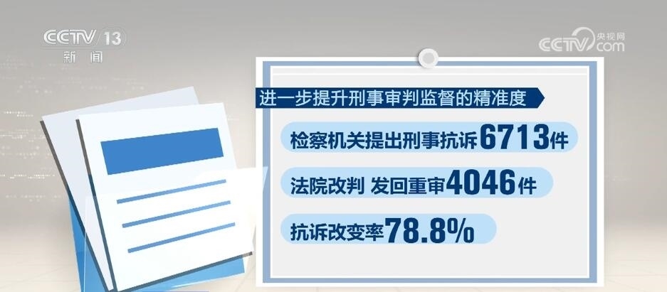 進一步提升刑事審判監(jiān)督的精準(zhǔn)度,檢察機關(guān)提出刑事抗訴6713件,法院改判、發(fā)回重審4046件,抗訴改變率78.8%。同時,檢察機關(guān)深化“派駐+巡回”檢察工作,對不當(dāng)減刑、假釋、暫予監(jiān)外執(zhí)行共提出糾正意見1.8萬人。