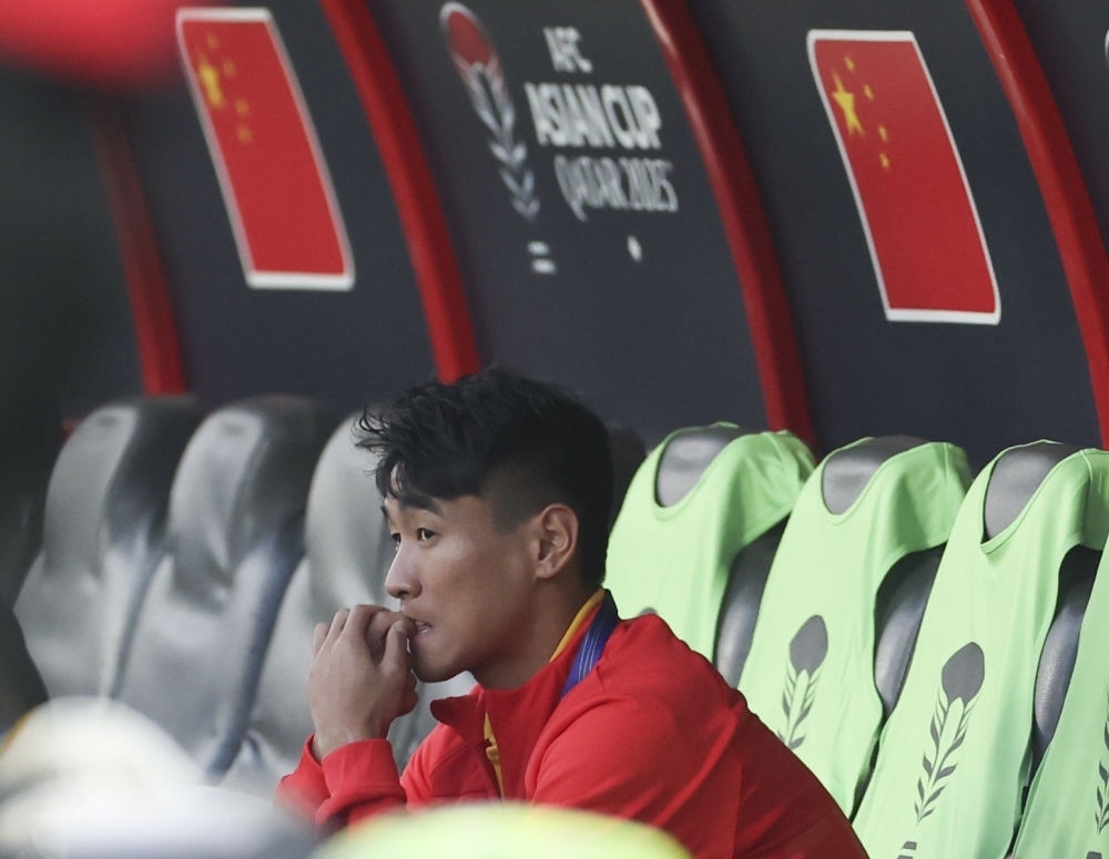 1月13日,中國(guó)隊(duì)對(duì)陣塔吉克斯坦隊(duì),圖為因傷未能進(jìn)入名單的韋世豪賽前在替補(bǔ)席上。新華社記者 曹燦 攝