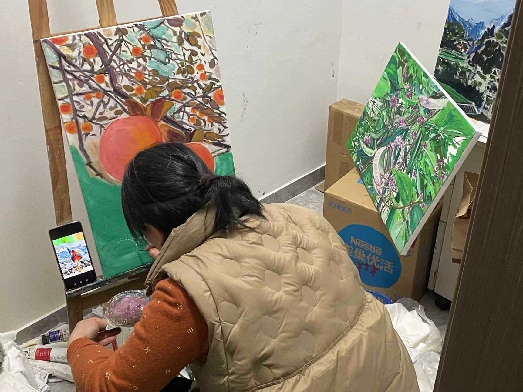 衛(wèi)生間一旁的儲物間里,擠滿了王柳云的畫作:河邊的野鴨,雷電亮起的剎那,還有富春山的冬和夏。40乘60厘米的畫布上,那些樹木,那些花草,香了滿世界。