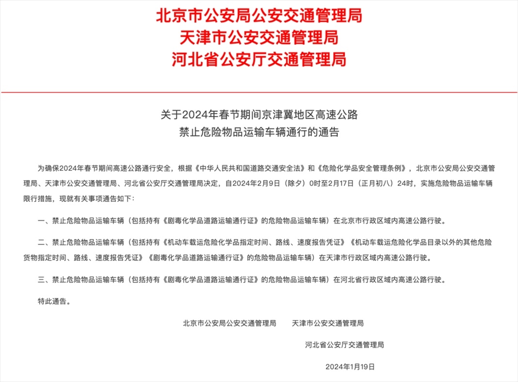 北京市公安局公安交通管理局、天津市公安交通管理局、河北省公安廳交通管理局決定,自2024年2月9日(除夕)0時(shí)至2月17日(正月初八)24時(shí),實(shí)施危險(xiǎn)物品運(yùn)輸車輛限行措施,現(xiàn)就有關(guān)事項(xiàng)通告如下: