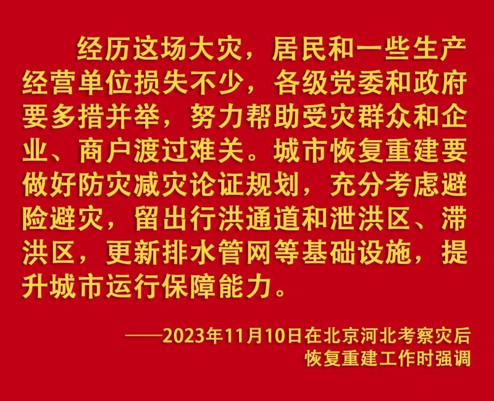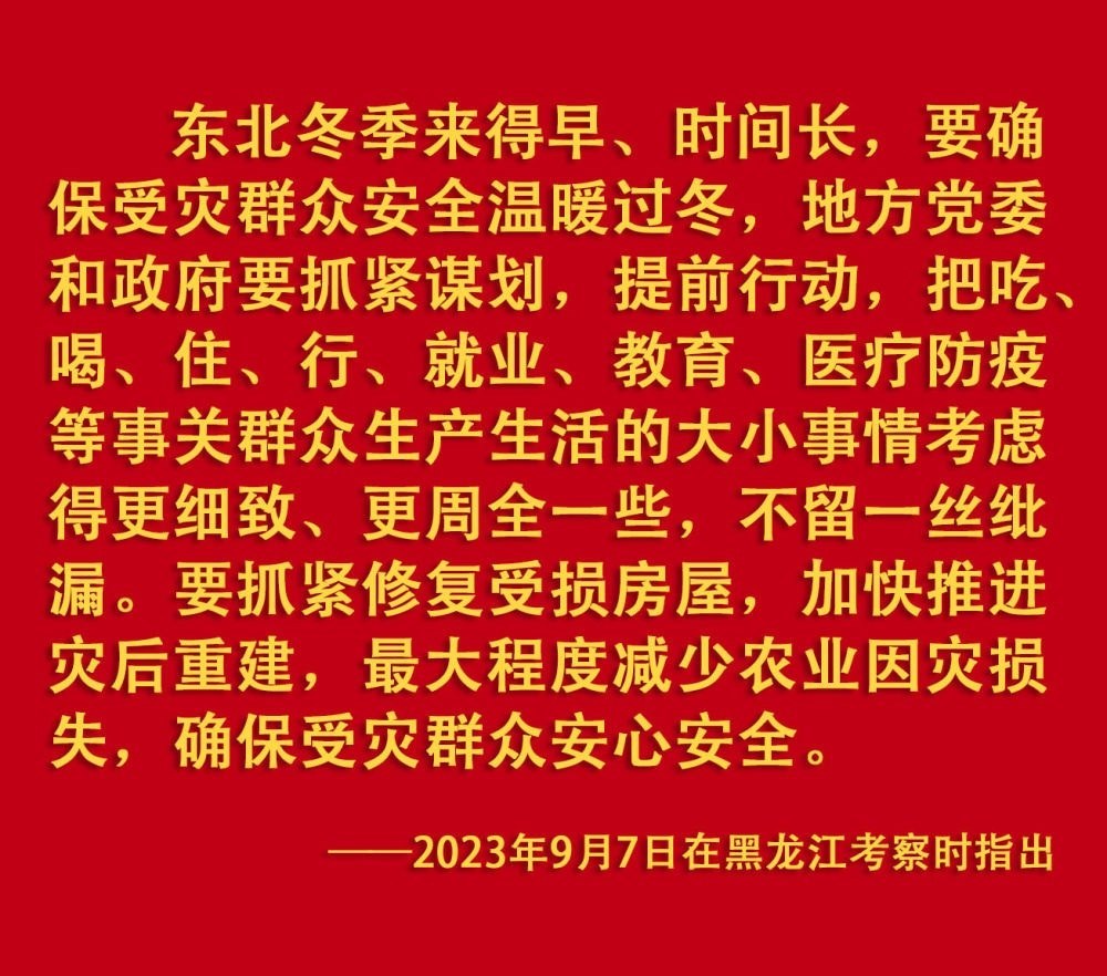 2023年汛期以來,我國華北、東北等地出現(xiàn)極端降雨,引發(fā)洪澇和地質災害。習近平一直牽掛著受災群眾,高度重視防汛抗洪救災和災后恢復重建工作,多次作出重要指示批示,要求有關地方和部門全力保障人民群眾生命財產(chǎn)安全,盡快恢復災區(qū)正常生產(chǎn)生活秩序。2023年9月上旬,習近平前往黑龍江尚志市看望慰問受災群眾;11月,北方入冬之際,習近平又來到北京、河北受災較重的相關地區(qū),看望慰問受災群眾,檢查指導災后恢復重建工作。