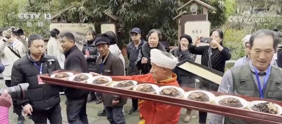 在熱鬧的現(xiàn)場,最引人注目的就是“打盆”絕技,這也是川渝地區(qū)獨(dú)有的民俗上菜表演。四層高的蒸籠冒著熱氣,民間藝人將蒸籠里的菜肴放在一個長2米、寬20厘米的木托盤里,將其頂在頭上,不用手扶,傳送到長桌宴上。