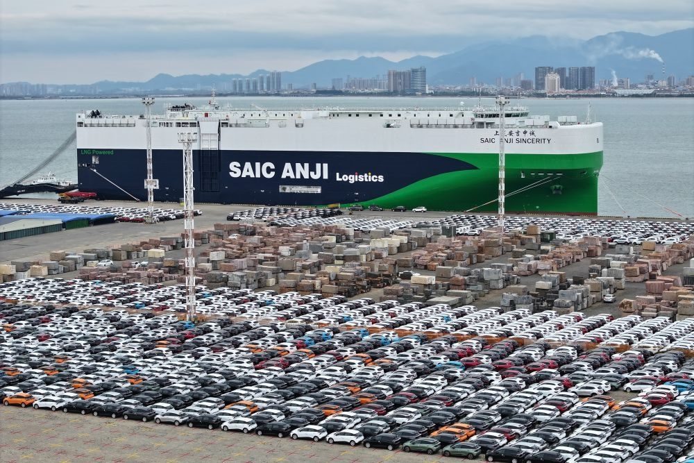 2024年1月23日,“上汽安吉申誠(chéng)”號(hào)汽車滾裝船??吭诟=◤B門東渡港區(qū)現(xiàn)代碼頭(無(wú)人機(jī)照片)。新華社記者 姜克紅 攝