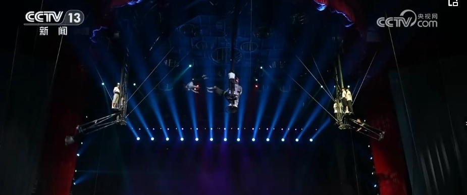 40多年來(lái),春晚劇組首次在1號(hào)廳高空安裝飛人裝置,道具和技巧以及創(chuàng)意的融合,完美演繹了傳說(shuō)中的魚(yú)躍龍門(mén)。