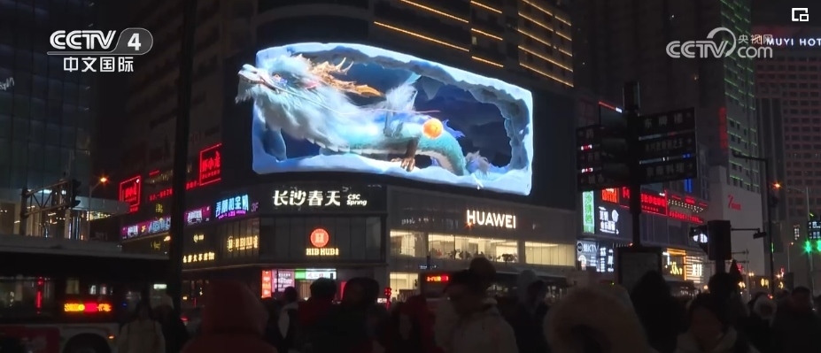 隨著夜幕降臨,在上海市南京西路這家商場戶外大屏,在裸眼3D技術的加持下,一條靈動時尚的“光影巨龍”騰飛而出。同時,上海南京西路商圈的多個地標建筑,也開啟了春節(jié)燈光演繹。
