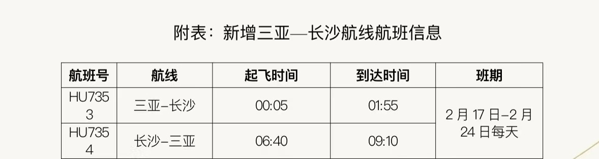 據(jù)悉,在民航局、海南省交通廳的支持下,海南航空積極協(xié)調(diào)申請加班計劃。2月17日至24日期間,海南航空每日新增三亞—長沙往返航班。去程航班HU7353,從三亞起飛時間為凌晨 00:05,到達(dá)長沙黃花國際機(jī)場時間為01:55;返程航班HU7354,從長沙起飛時間為06:40,到達(dá)三亞鳳凰國際機(jī)場時間為09:10,以上航班信息以實際查詢?yōu)闇?zhǔn)。旅客可通過海南航空官網(wǎng)及APP、微信公眾號及小程序、服務(wù)熱線95339、各直屬售票處及授權(quán)代理購買機(jī)票。