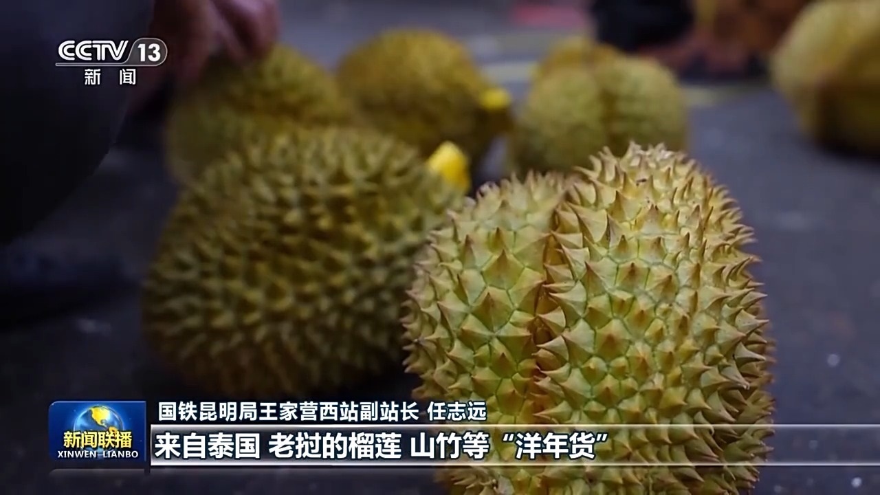 國鐵昆明局王家營西站副站長 任志遠:今年以來,車站進出口貨物明顯增加,來自泰國、老撾的榴蓮、山竹等“洋年貨”源源不斷運抵。國內(nèi)的“國貨潮牌”陸續(xù)運往東南亞國家。