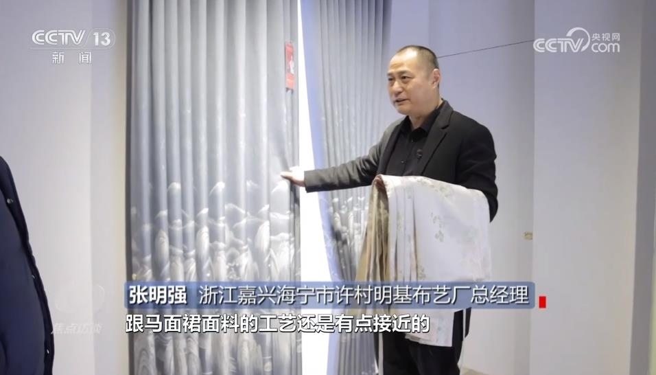 浙江嘉興海寧市許村明基布藝廠總經(jīng)理張明強(qiáng):“提花其實(shí)比較接近,跟馬面裙面料的工藝有點(diǎn)接近,但是馬面裙的密度會超過它很多?!?/p>