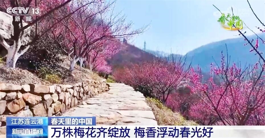 春日暖陽中,江蘇連云港花果山漫山遍野的梅花悄然綻放,紅梅花開似海、明媚驚艷,遠看如云霞燦爛,近聞有盈袖暗香?;ü矫穲@經(jīng)過多年的栽植培育,有紅梅、美人梅、綠萼梅等梅樹2萬多株。