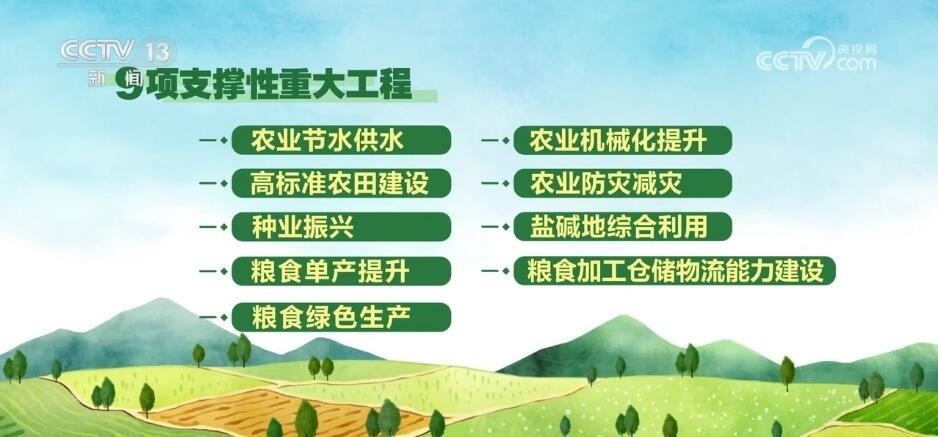 與此同時,《方案》還圍繞糧食生產(chǎn)的關(guān)鍵領(lǐng)域和薄弱環(huán)節(jié),謀劃部署了農(nóng)業(yè)節(jié)水供水、高標(biāo)準(zhǔn)農(nóng)田建設(shè)、種業(yè)振興、糧食單產(chǎn)提升、糧食綠色生產(chǎn)、農(nóng)業(yè)機械化提升、農(nóng)業(yè)防災(zāi)減災(zāi)、鹽堿地綜合利用、糧食加工倉儲物流能力建設(shè)等9項支撐性重大工程。