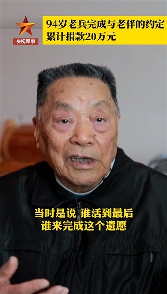 94歲老兵曾讓泉,78歲簽下捐贈(zèng)眼角膜協(xié)議,85歲開(kāi)始捐款,至今共計(jì)20萬(wàn)元。曾讓泉說(shuō),老伴2014年走了,當(dāng)時(shí)約定誰(shuí)活到最后誰(shuí)來(lái)完成每年省下錢(qián)來(lái)捐款這個(gè)遺愿。