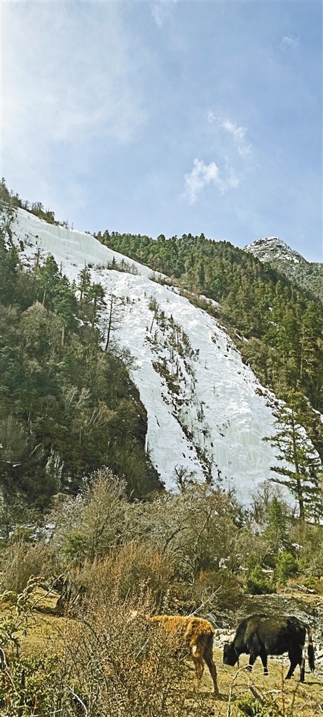 尼屋分為上尼屋和下尼屋。沿著尼屋藏布一路向上幾十公里,就來到上尼屋,夾岸兩山草木茂盛、松柏蒼翠、牛馬成群。但最讓人驚喜的是依嘎瀑布和依嘎冰川,依嘎瀑布飛瀉直下,流入尼屋藏布,依嘎冰川遠看如婚紗裙擺飄灑山間,近看是明顯的冰川融化形成山體斷面。