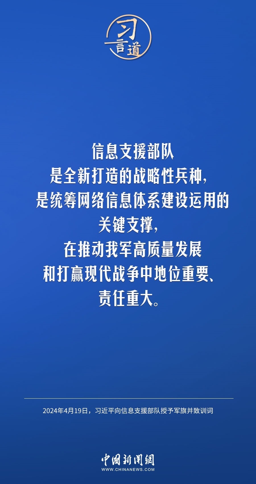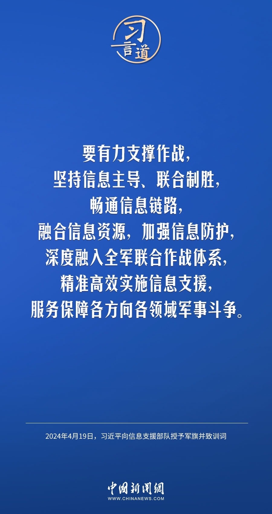 中國人民解放軍信息支援部隊成立大會19日在北京八一大樓隆重舉行。中共中央總書記、國家主席、中央軍委主席習近平向信息支援部隊授予軍旗并致訓詞,代表黨中央和中央軍委向信息支援部隊全體官兵致以熱烈祝賀。他強調(diào)——
