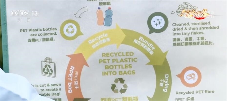 記者發(fā)現(xiàn)了一種用PET塑料瓶為原料制成的環(huán)保購物袋。PET簡稱聚酯,是一種常見的塑料材料,企業(yè)將這類塑料瓶回收后,經(jīng)過處理變成細小的瓶片,再經(jīng)融化和擠壓后變成纖維、織成布,最后就得到了一個可以循環(huán)使用的購物袋。