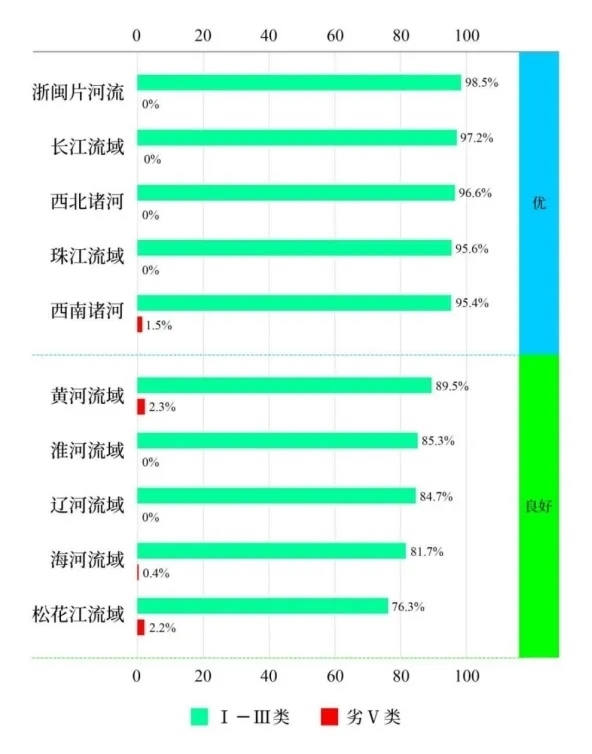 1—3月,長江、黃河、珠江、松花江、淮河、海河、遼河等七大流域及西北諸河、西南諸河和浙閩片河流水質優(yōu)良(Ⅰ—Ⅲ類)斷面比例為91.5%,同比上升1.2個百分點;劣Ⅴ類斷面比例為0.5%,同比上升0.1個百分點。主要污染指標為化學需氧量、高錳酸鹽指數(shù)和氨氮。其中,長江流域、珠江流域、浙閩片河流、西北諸河和西南諸河水質為優(yōu);黃河流域、松花江流域、淮河流域、海河流域和遼河流域水質良好。