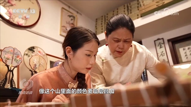 盧建英是蘇州當(dāng)?shù)赜忻奶K繡代表性傳承人。記者見(jiàn)到她的時(shí)候,她正在指導(dǎo)女兒刺繡。