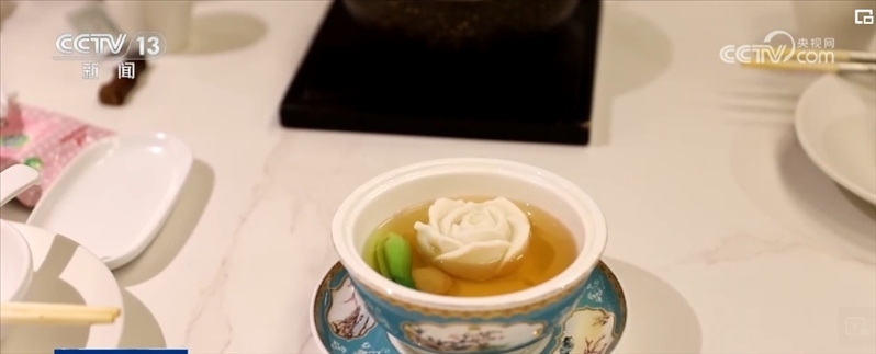 不僅僅是氛圍的打造,菜品創(chuàng)意也在還原原著中十二道菜品的基礎(chǔ)上,再對其進(jìn)行創(chuàng)新和延伸, “可卿山藥棗泥糕”“鳳姐火腿肘子”“寶釵胭脂鵝”等獨(dú)具紅樓特色的菜品,都可以在這里吃到。這朵以假亂真的花朵是這里的一道招牌菜,由魚茸制作而成的“黛玉傳花”,來自上海的房阿姨對這道菜尤為喜愛。