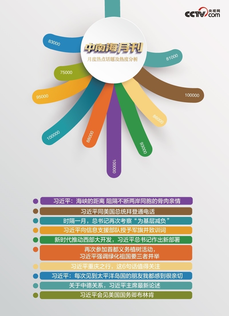 央視網(wǎng)“智聞”系統(tǒng)提取分析2024年4月全網(wǎng)時(shí)政新聞熱點(diǎn)顯示,“時(shí)隔一月,總書記再次考察‘為基層減負(fù)’”“習(xí)近平向信息支援部隊(duì)授予軍旗并致訓(xùn)詞”“習(xí)近平同美國總統(tǒng)拜登通電話”等話題備受關(guān)注。