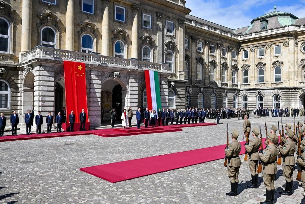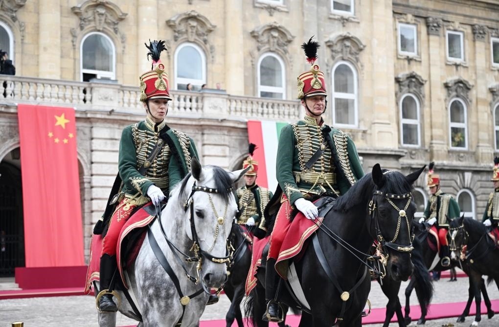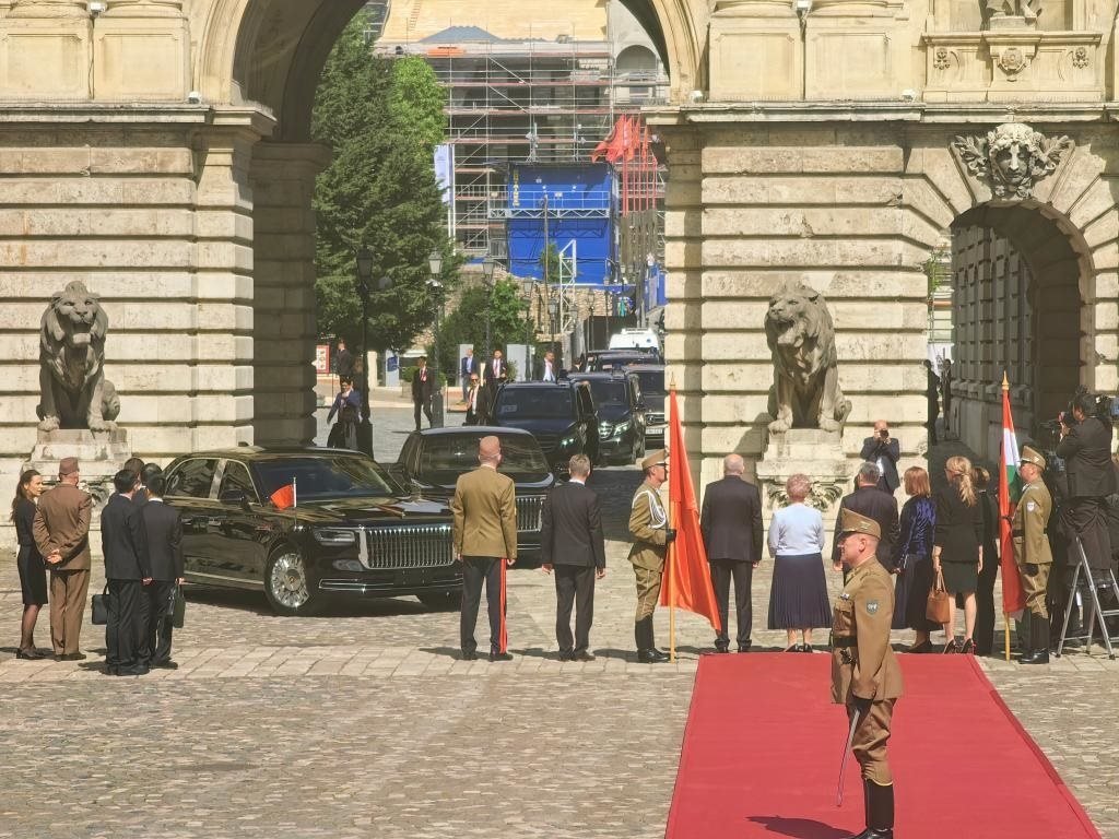 初夏時(shí)節(jié)的布達(dá)佩斯陽(yáng)光明媚,古老宏偉的布達(dá)王宮莊嚴(yán)矗立,中匈兩國(guó)國(guó)旗相映成輝。習(xí)近平和夫人彭麗媛乘坐的國(guó)賓車隊(duì)在匈牙利禮賓馬隊(duì)護(hù)衛(wèi)下緩緩駛?cè)氩歼_(dá)王宮內(nèi)庭。舒尤克總統(tǒng)夫婦和歐爾班總理夫婦熱情迎接。