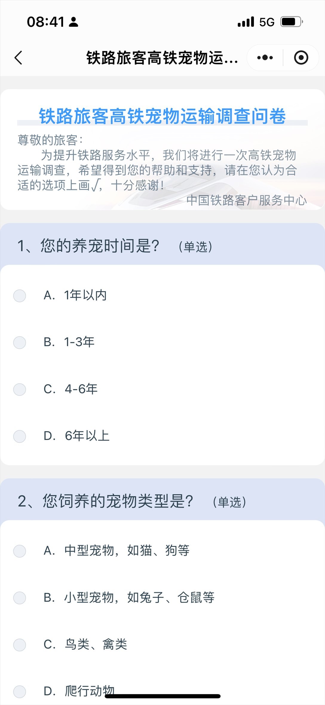 中國鐵路客戶服務(wù)中心推出高鐵寵物運(yùn)輸調(diào)查問卷。 截屏圖