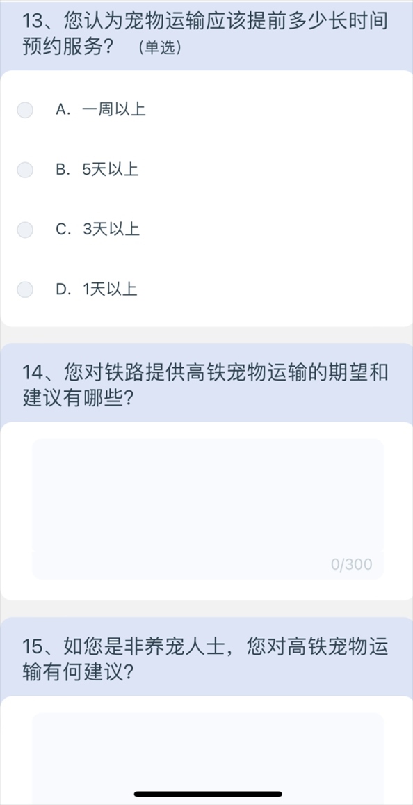 5月10日上午8點(diǎn)40分,澎湃新聞?dòng)浾咄ㄟ^掃描網(wǎng)友分享的列車上的二維碼,進(jìn)入12306系統(tǒng),選擇問卷·建議,進(jìn)入“鐵路旅客高鐵寵物運(yùn)輸”調(diào)查,共15個(gè)問題,涉及養(yǎng)寵類型、是否有攜帶寵物出行的需求、如果鐵路提供寵物運(yùn)輸服務(wù)是否愿意嘗試等,以及為降低對(duì)其他旅客的影響,在高鐵寵物運(yùn)輸更關(guān)注哪方面的防護(hù);如鐵路提供高鐵寵物運(yùn)輸服務(wù),期望的定價(jià)標(biāo)準(zhǔn);如鐵路提供高鐵寵物運(yùn)輸服務(wù),最關(guān)注的內(nèi)容;如果是非養(yǎng)寵人士,對(duì)高鐵寵物運(yùn)輸有何建議等多方面問題。