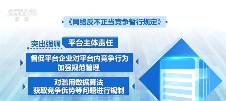 平臺(tái)企業(yè)掌握海量數(shù)據(jù),連接大量主體,既是網(wǎng)絡(luò)不正當(dāng)競(jìng)爭(zhēng)監(jiān)管的重點(diǎn)對(duì)象,也是協(xié)同監(jiān)管的關(guān)鍵節(jié)點(diǎn)。《規(guī)定》突出強(qiáng)調(diào)了平臺(tái)主體責(zé)任,督促平臺(tái)企業(yè)對(duì)平臺(tái)內(nèi)競(jìng)爭(zhēng)行為加強(qiáng)規(guī)范管理,同時(shí)對(duì)濫用數(shù)據(jù)算法獲取競(jìng)爭(zhēng)優(yōu)勢(shì)等問(wèn)題進(jìn)行規(guī)制。