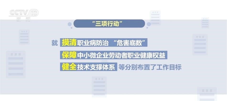 “三項(xiàng)行動(dòng)”工作方案包括《職業(yè)病危害項(xiàng)目申報(bào)擴(kuò)面行動(dòng)(2024—2025年)工作方案》《中小微企業(yè)職業(yè)健康幫扶行動(dòng)(2024—2025年)工作方案》《職業(yè)病防治機(jī)構(gòu)提質(zhì)合規(guī)行動(dòng)(2024—2025年)工作方案》。