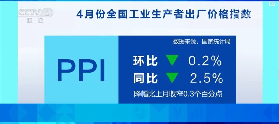 4月份,工業(yè)生產(chǎn)繼續(xù)恢復(fù),全國(guó)工業(yè)生產(chǎn)者出廠價(jià)格指數(shù)PPI環(huán)比下降0.2%,同比下降2.5%,降幅比上月收窄0.3個(gè)百分點(diǎn)。