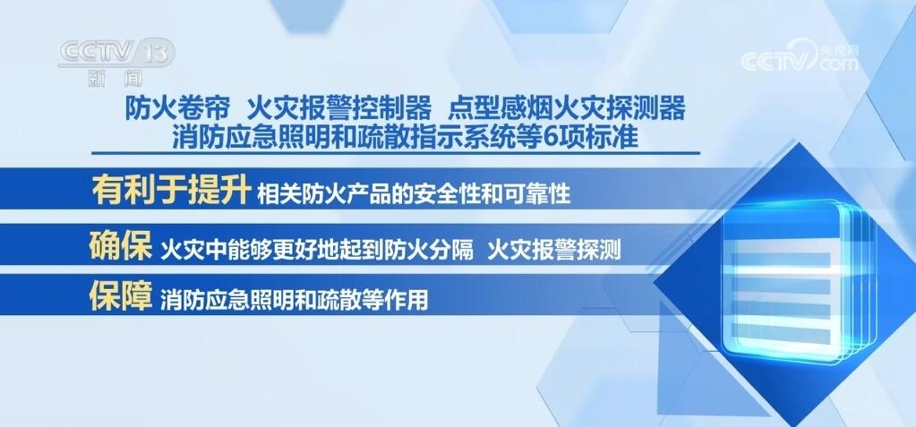 防火卷簾、火災(zāi)報(bào)警控制器、點(diǎn)型感煙火災(zāi)探測器、消防應(yīng)急照明和疏散指示系統(tǒng)等6項(xiàng)標(biāo)準(zhǔn)有利于提升相關(guān)防火產(chǎn)品的安全性和可靠性,確保其在火災(zāi)中能夠更好地起到防火分隔、火災(zāi)報(bào)警探測,保障消防應(yīng)急照明和疏散等作用。應(yīng)急避難場所、救災(zāi)帳篷等4項(xiàng)標(biāo)準(zhǔn)可確保受災(zāi)人員得到更安全、更舒適的臨時安置。