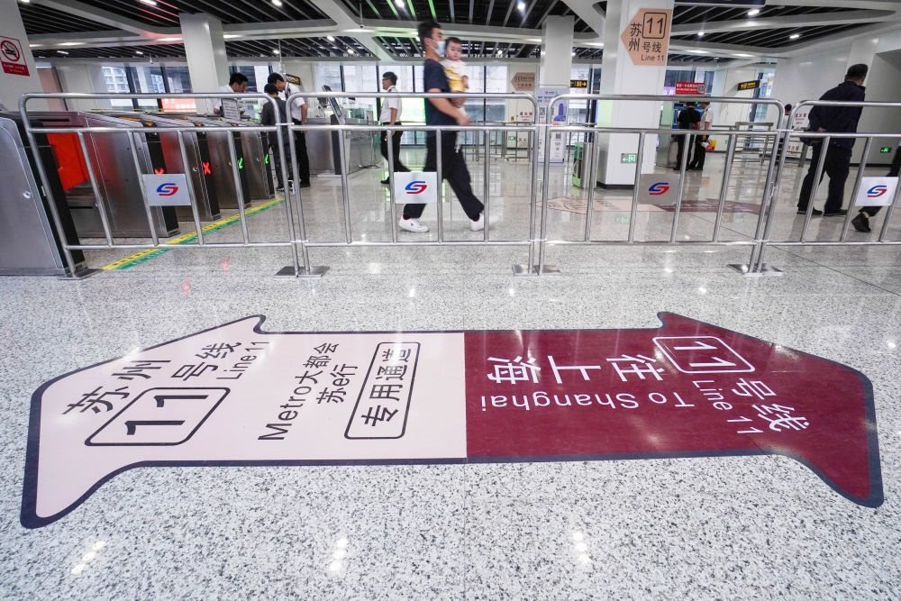 2023年6月24日,乘客在蘇州軌道交通11號線花橋站進(jìn)站乘車。當(dāng)日,蘇州軌道交通11號線正式投入運(yùn)營,并與上海軌道交通11號線實(shí)現(xiàn)無縫換乘,長三角核心城市間首次實(shí)現(xiàn)地鐵系統(tǒng)跨省互聯(lián)互通。新華社記者 李博 攝