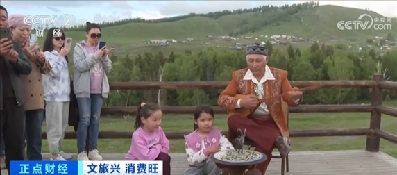 這位哈薩克族老人正在表演的木偶山羊舞是阿勒泰地區(qū)級(jí)非物質(zhì)文化遺產(chǎn),木偶山羊身上的線繩與老人的手指相連,隨著音樂的節(jié)奏,山羊翩翩起舞。這樣的表演吸引了不少游客前來欣賞。