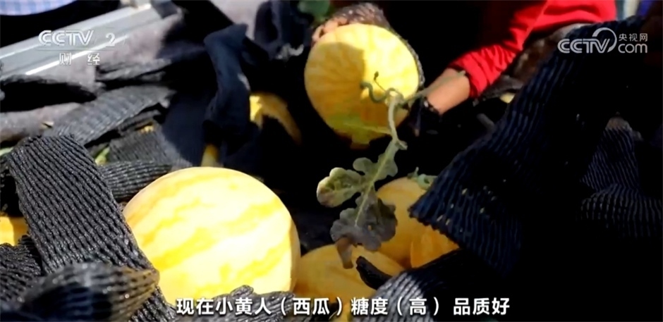 西瓜收購商稱:“我今天來這兒收小黃人西瓜,發(fā)往鄭州、北京、上海,各個(gè)大城市都發(fā)?,F(xiàn)在,小黃人西瓜糖度高、品質(zhì)好。
