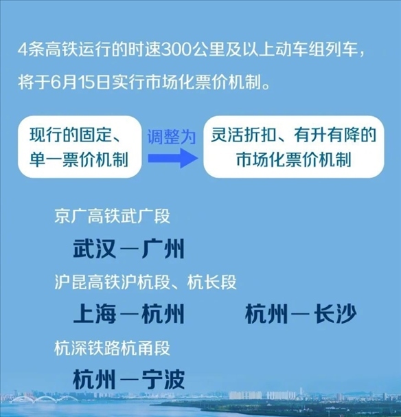 ·6月1日開(kāi)售實(shí)行市場(chǎng)化票價(jià)機(jī)制的4條高鐵車(chē)票,最低55折。