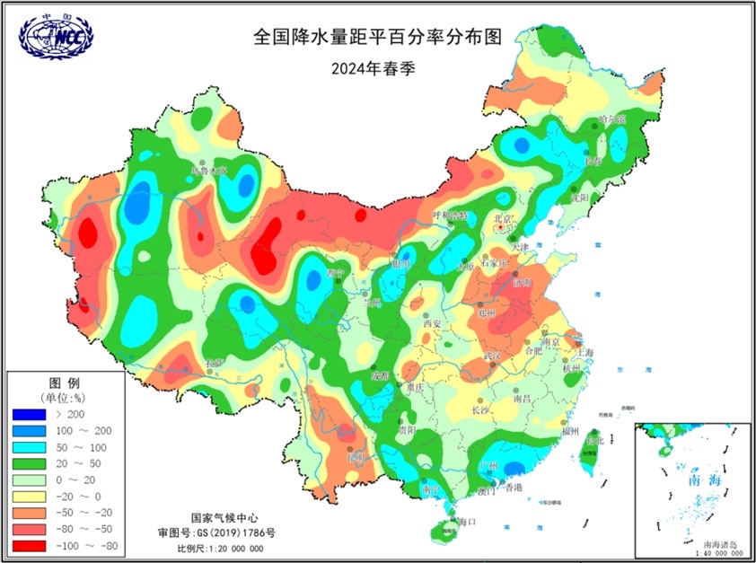 圖4 2024年春季全國降水量距平百分率分布圖(單位:%)