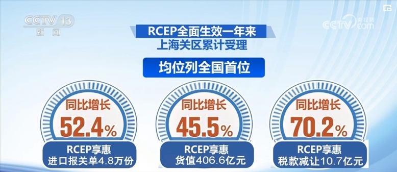 在上海,RCEP全面生效一年來,上海關(guān)區(qū)累計(jì)受理RCEP享惠進(jìn)口報(bào)關(guān)單4.8萬份,貨值406.6億元,稅款減讓10.7億元,均位列全國首位,同比分別增長52.4%、45.5%和70.2%,