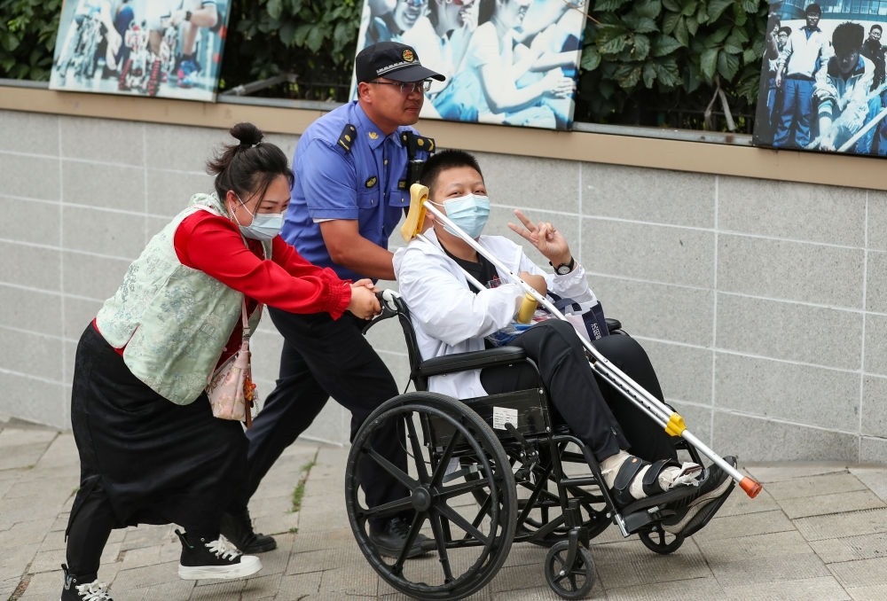 ↑6月7日,在哈爾濱市第三中學(xué)考點(diǎn),一名腳部受傷的考生在工作人員攙扶下走出考場(chǎng)。