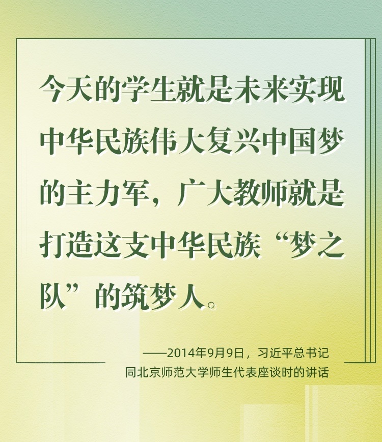 教師是立教之本、興教之源。2024年9月10日,是我國(guó)第40個(gè)教師節(jié)。黨的十八大以來(lái),習(xí)近平總書記始終高度重視教師隊(duì)伍建設(shè),立足實(shí)現(xiàn)中華民族偉大復(fù)興中國(guó)夢(mèng)、打造中華民族“夢(mèng)之隊(duì)”筑夢(mèng)人的特殊歷史使命,對(duì)教師相繼提出了“四有好老師”“四個(gè)引路人”“四個(gè)相統(tǒng)一”“大先生”等殷切期望和明確要求。