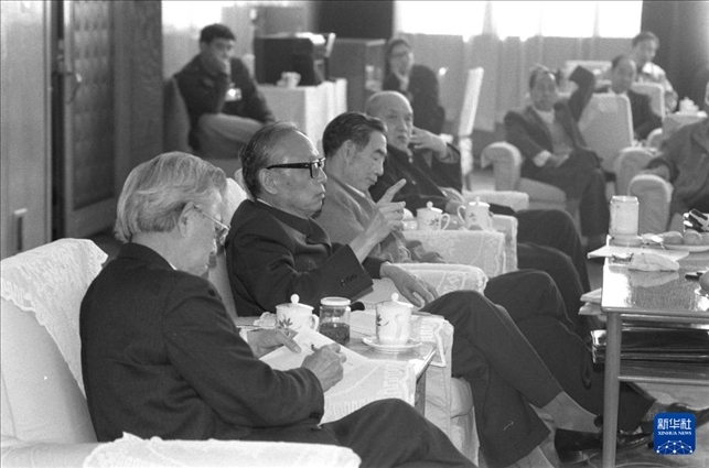 1991年4月6日,任建新同志(左二)參加七屆全國(guó)人大四次會(huì)議山西省代表團(tuán)小組會(huì),聽取代表們對(duì)最高人民法院工作報(bào)告的意見。
