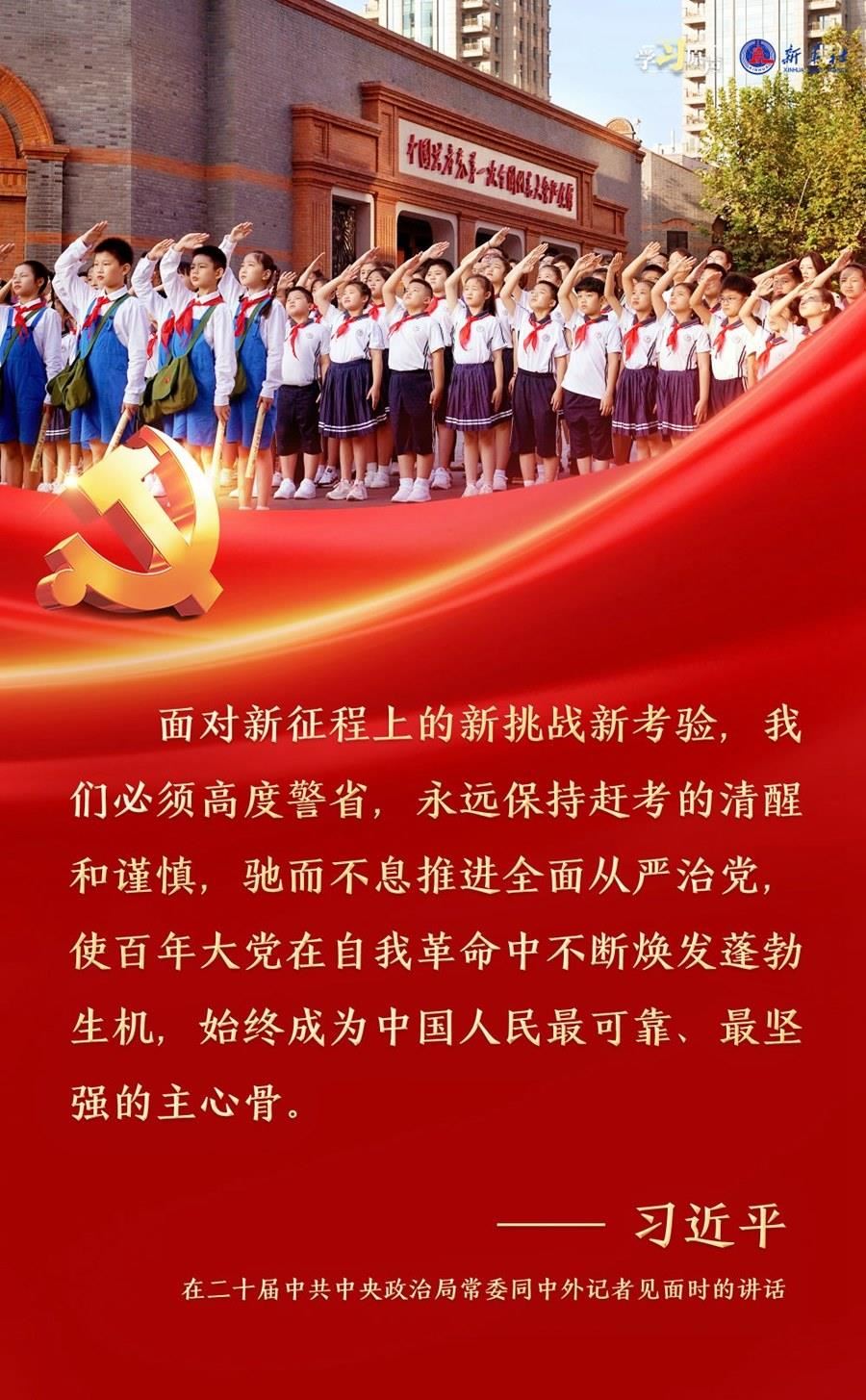 習近平總書記強調(diào),面對新征程上的新挑戰(zhàn)新考驗,我們必須高度警省,永遠保持趕考的清醒和謹慎,馳而不息推進全面從嚴治黨,使百年大黨在自我革命中不斷煥發(fā)蓬勃生機,始終成為中國人民最可靠、最堅強的主心骨。