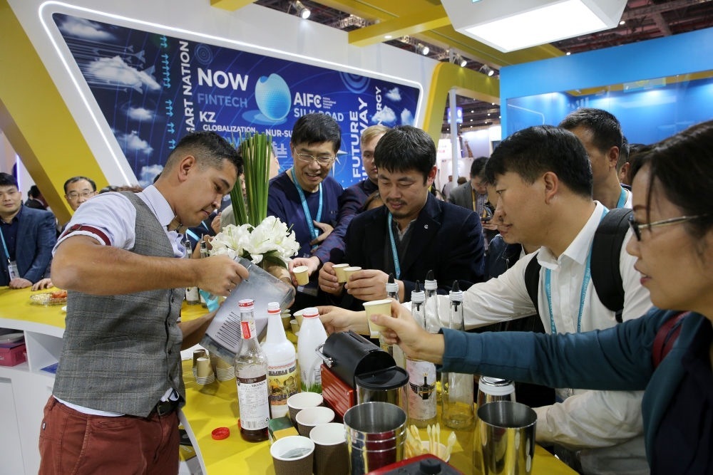 2019年11月6日,在上海進(jìn)博會哈薩克斯坦國家館,調(diào)酒師為參觀者分享雞尾酒。