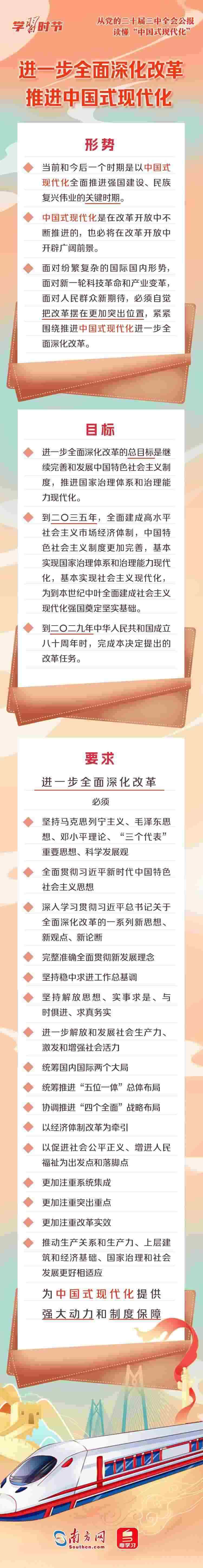 中國式現(xiàn)代化是中國共產(chǎn)黨和中國人民長(zhǎng)期實(shí)踐探索的成果,是一項(xiàng)偉大而艱巨的事業(yè)。全會(huì)公報(bào)中,“中國式現(xiàn)代化”一詞被反復(fù)提及,深刻闡述了進(jìn)一步全面深化改革與推進(jìn)中國式現(xiàn)代化的關(guān)系,以及中國式現(xiàn)代化的重要保障、必然要求、本質(zhì)要求等重要內(nèi)容。一起來學(xué)習(xí)!